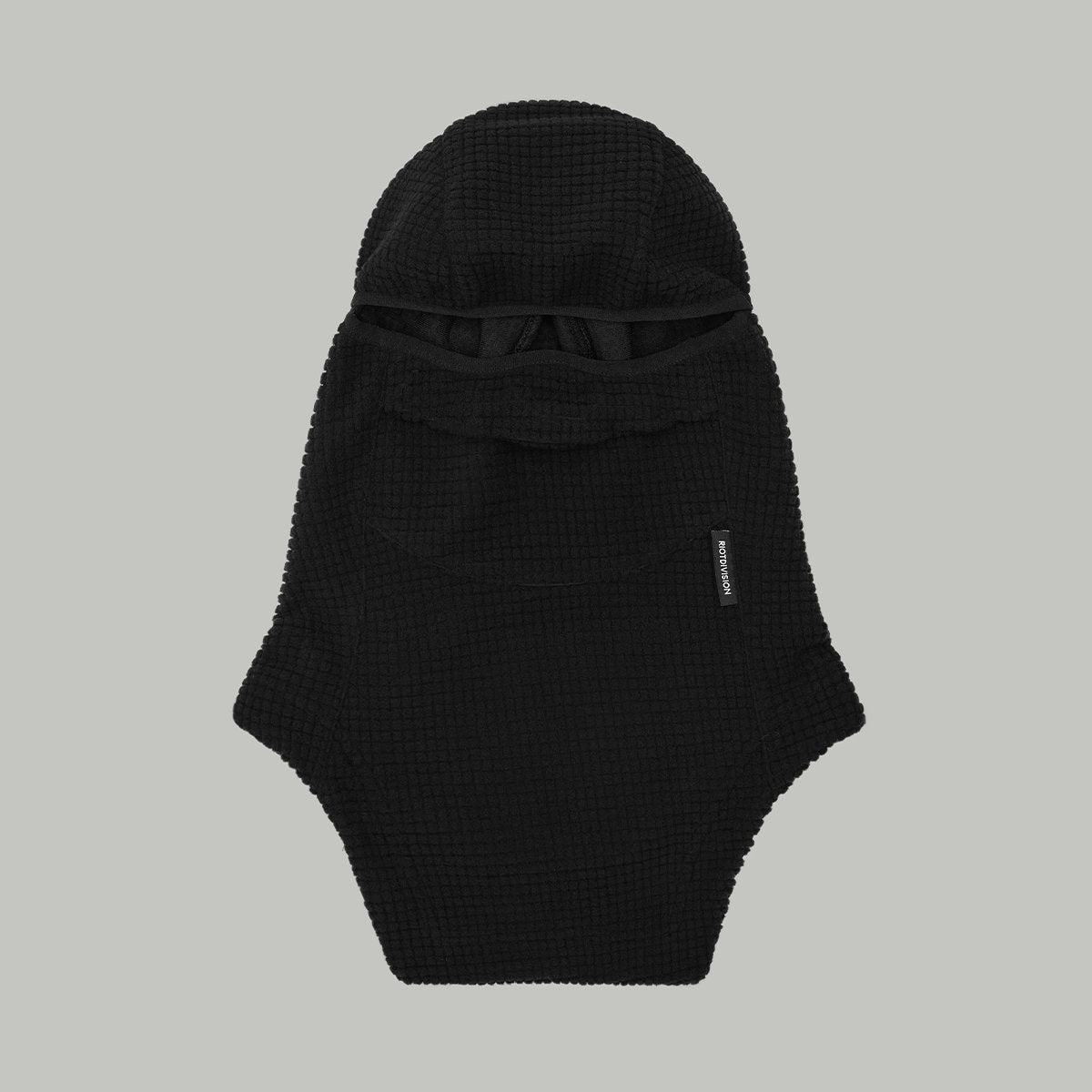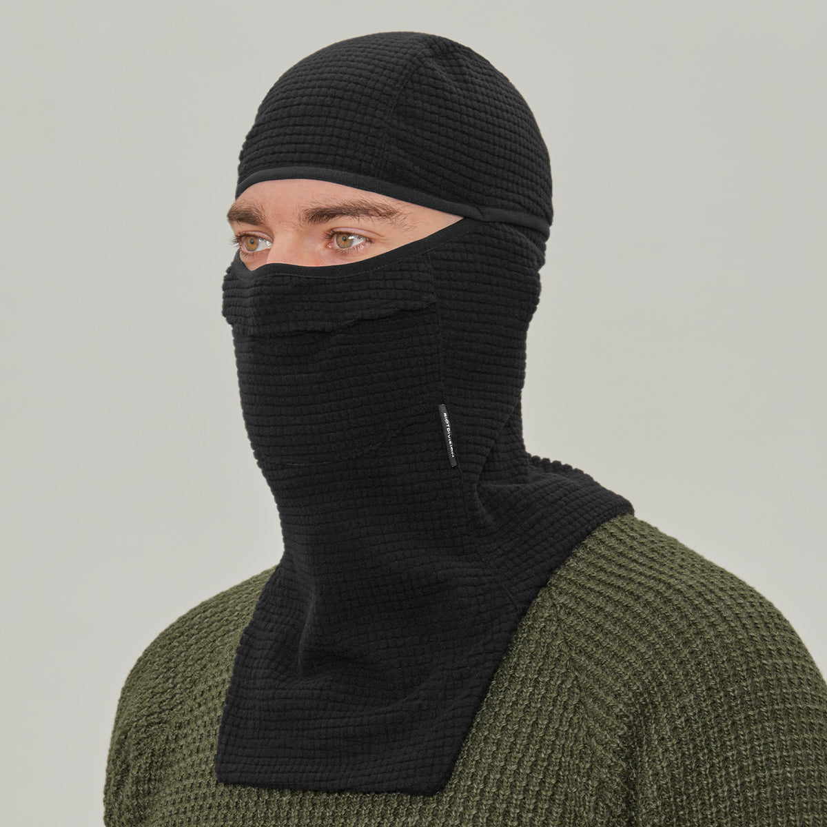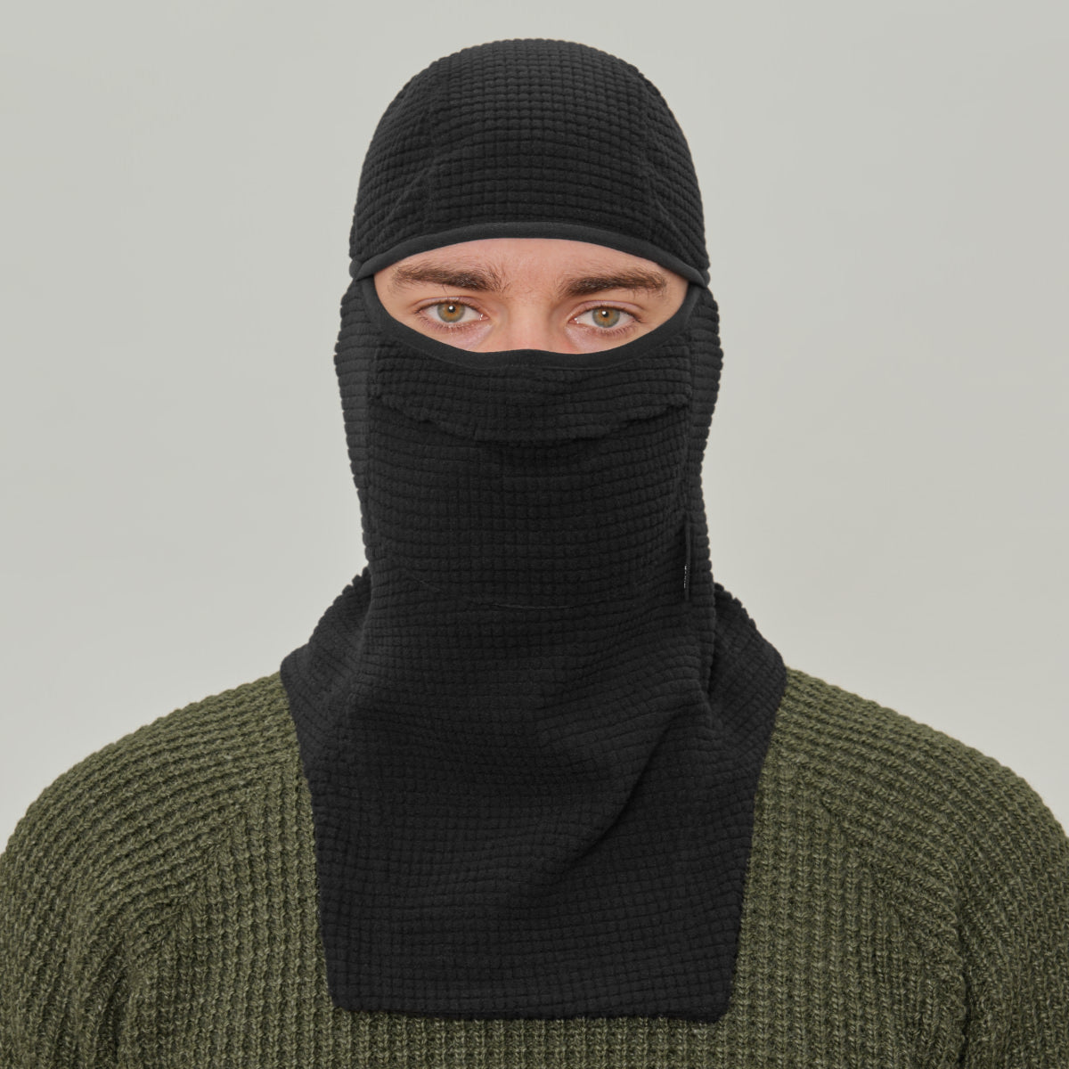 Balaclava made grid fleece. May be worn with the exposed eyes only, face only or as a neck protector.