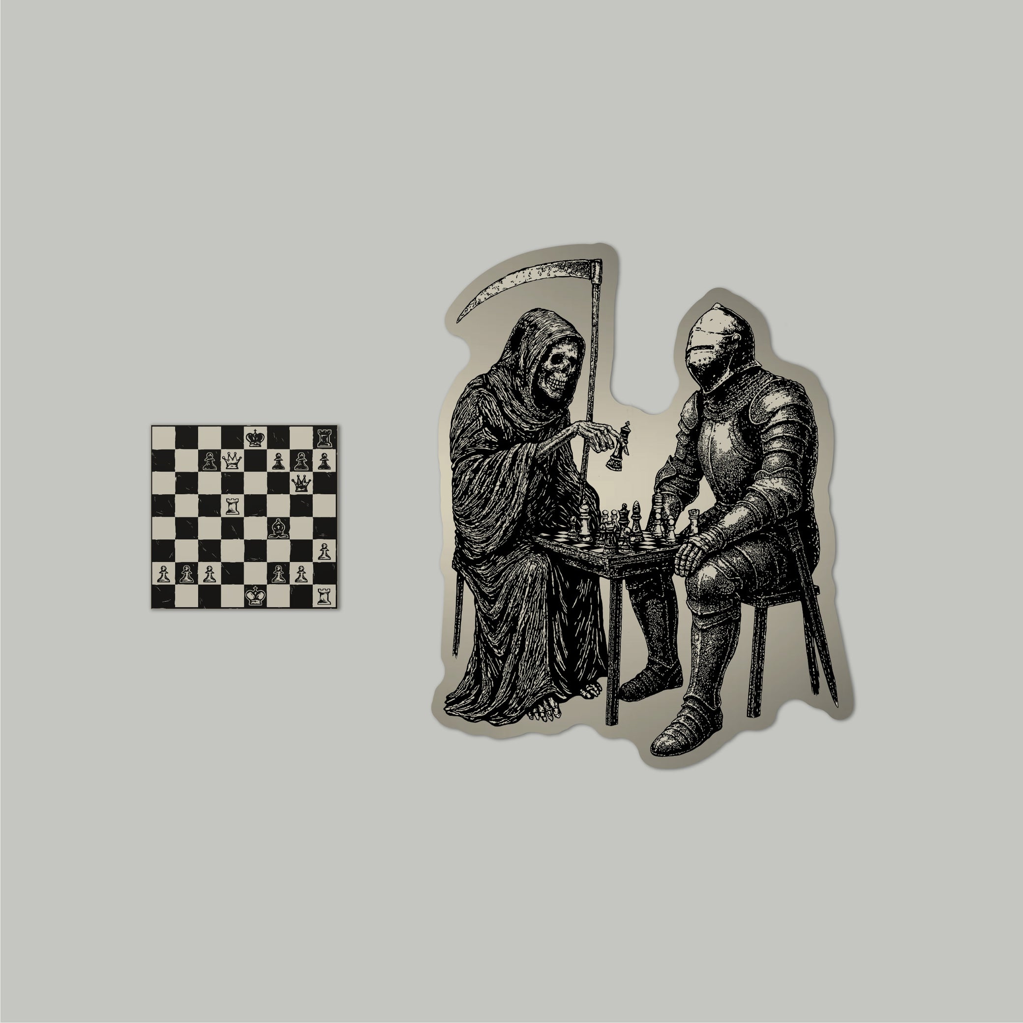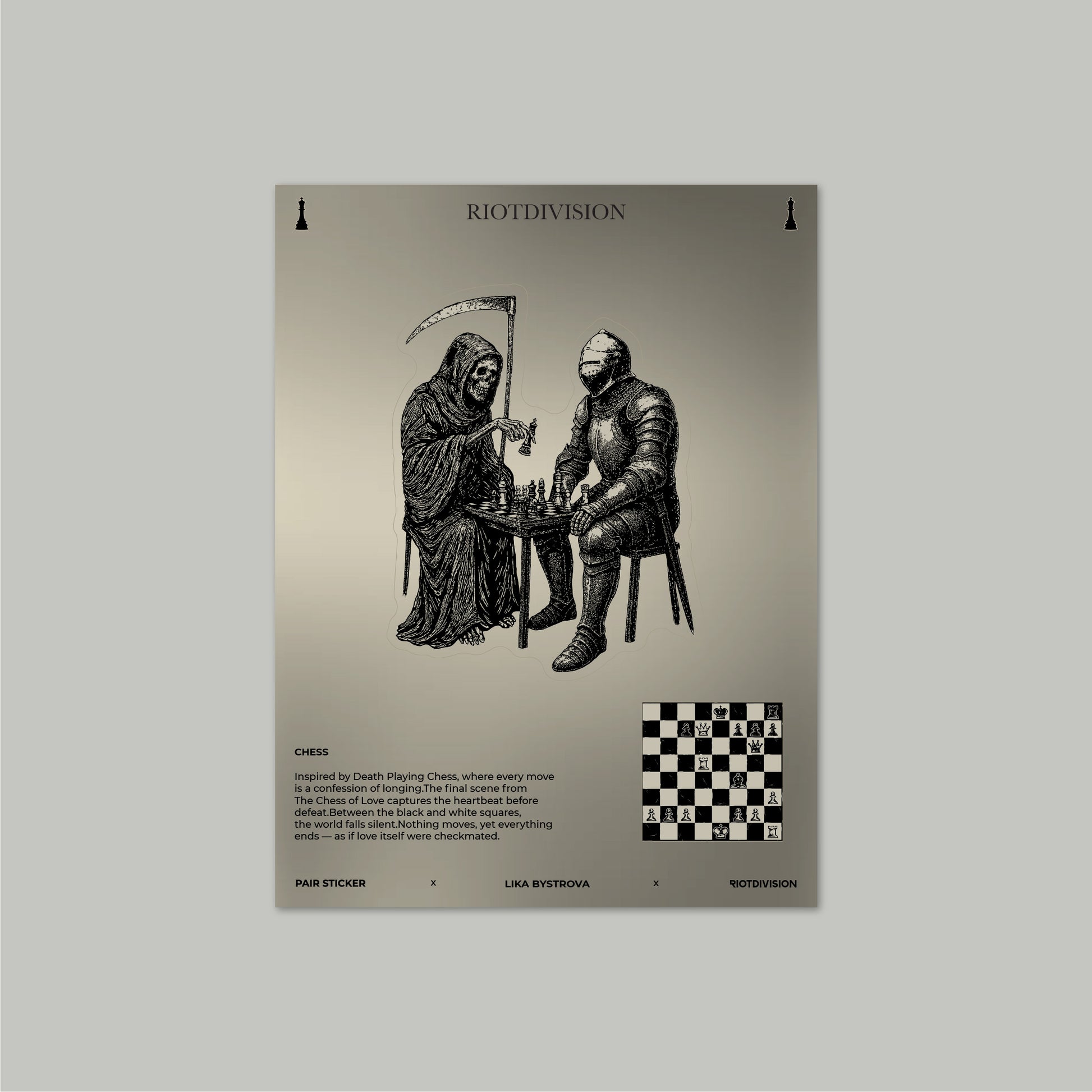Inspired by Death Playing Chess, where every move is a confession of longing. The final scene from The Chess of Love captures the heartbeat before defeat. Between the black and white squares, the world falls silent. Nothing moves, yet everything ends — as if love itself were checkmated.