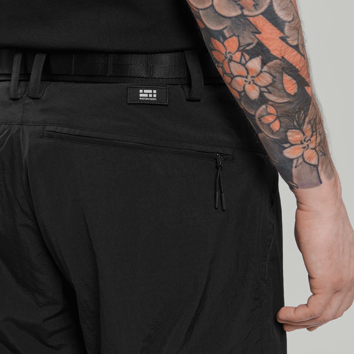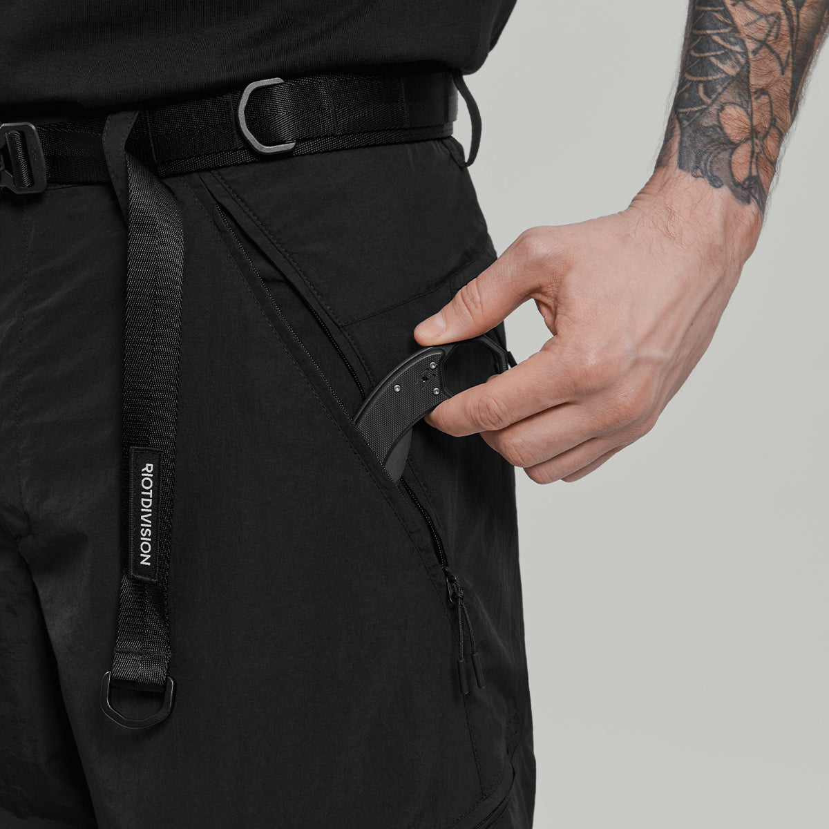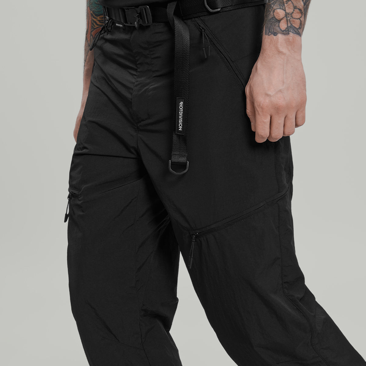 - zipped pockets on the thighs