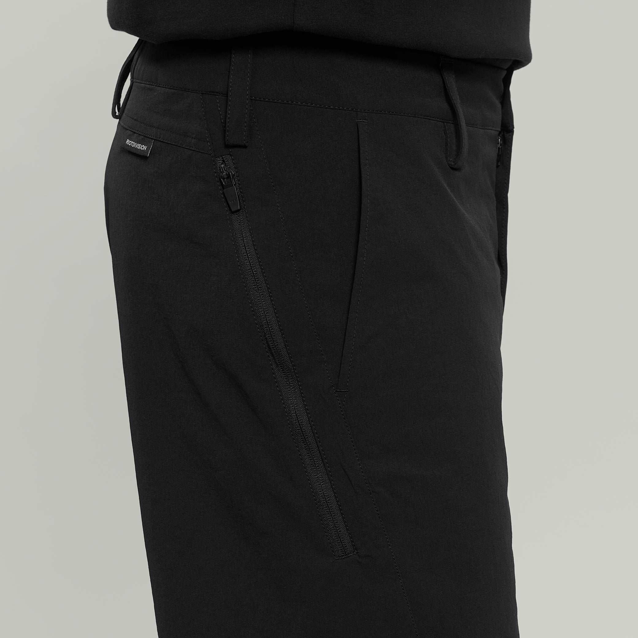 - concealed zipped internally separated pocket on the right thigh with conjoined frontal and back compartments