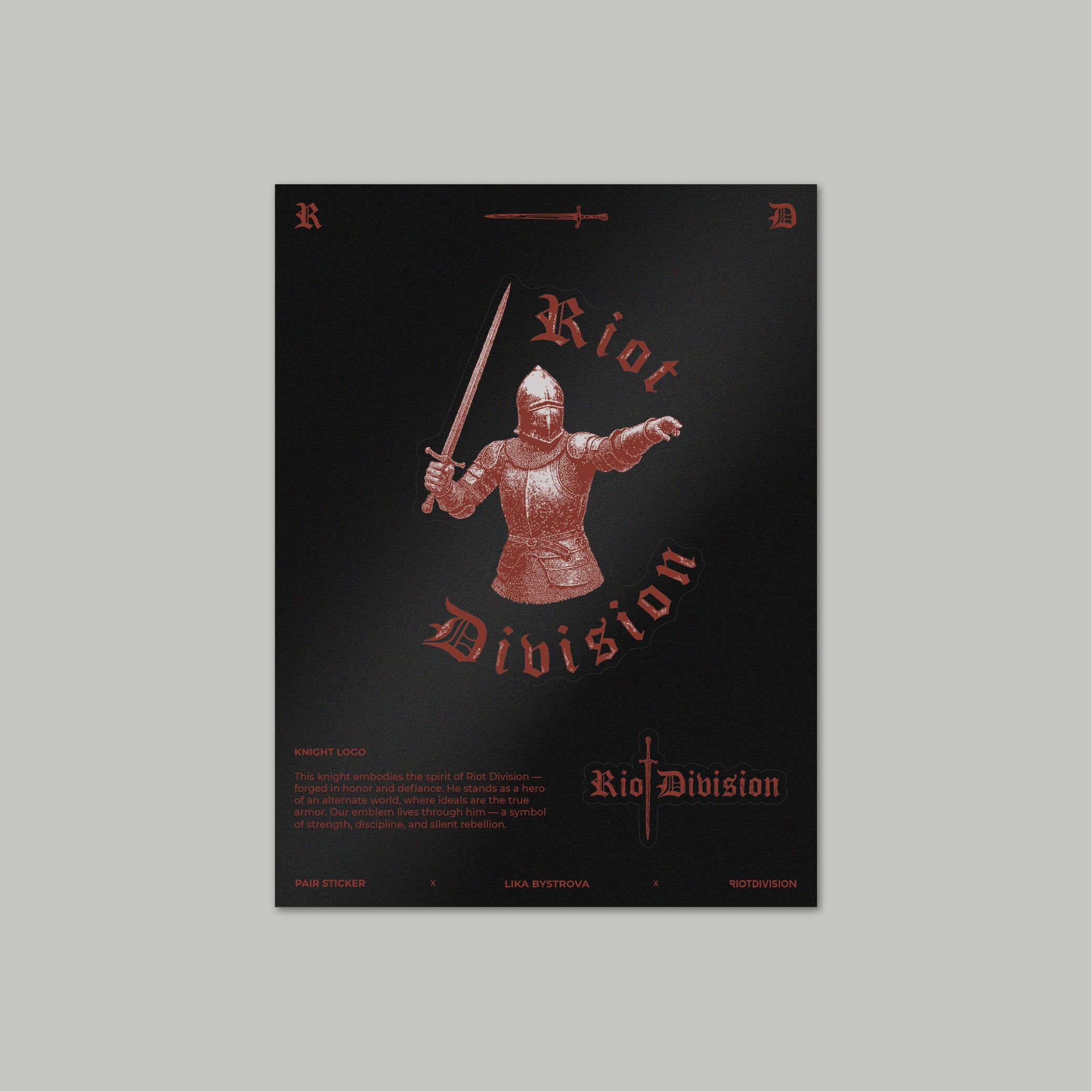 This knight embodies the spirit of RIOTDIVISION — forged in honor and defiance. He stands as a hero of an alternate world, where ideals are the true armor. Our emblem lives through him — a symbol of strength, discipline, and silent rebellion.