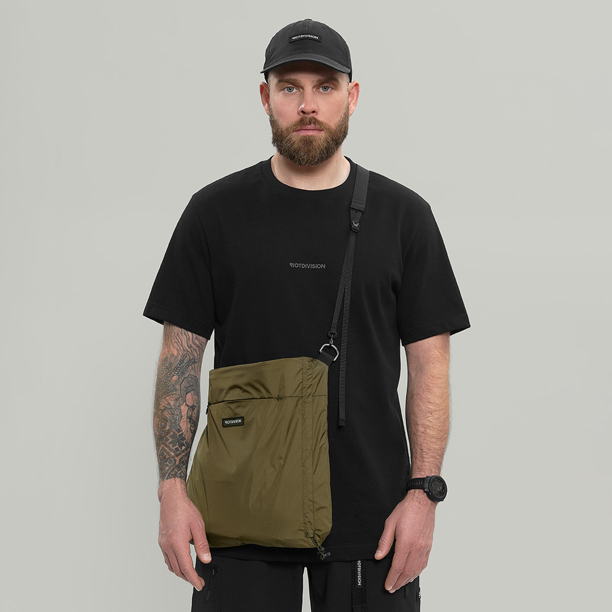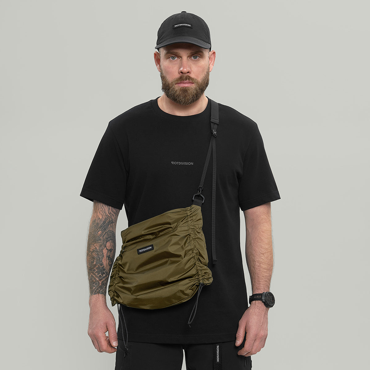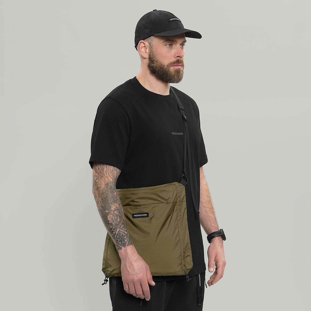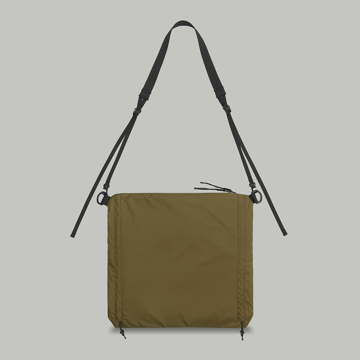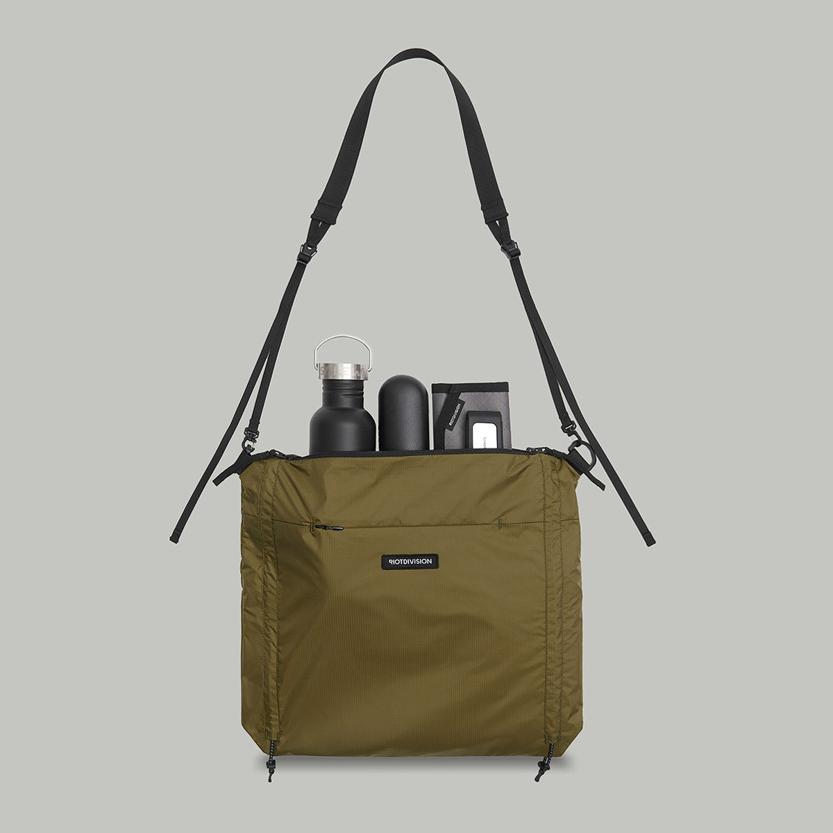 Lightweight shoulder bag made of ripstop nylon with elastic cords on the sides to provide volume adjustability.