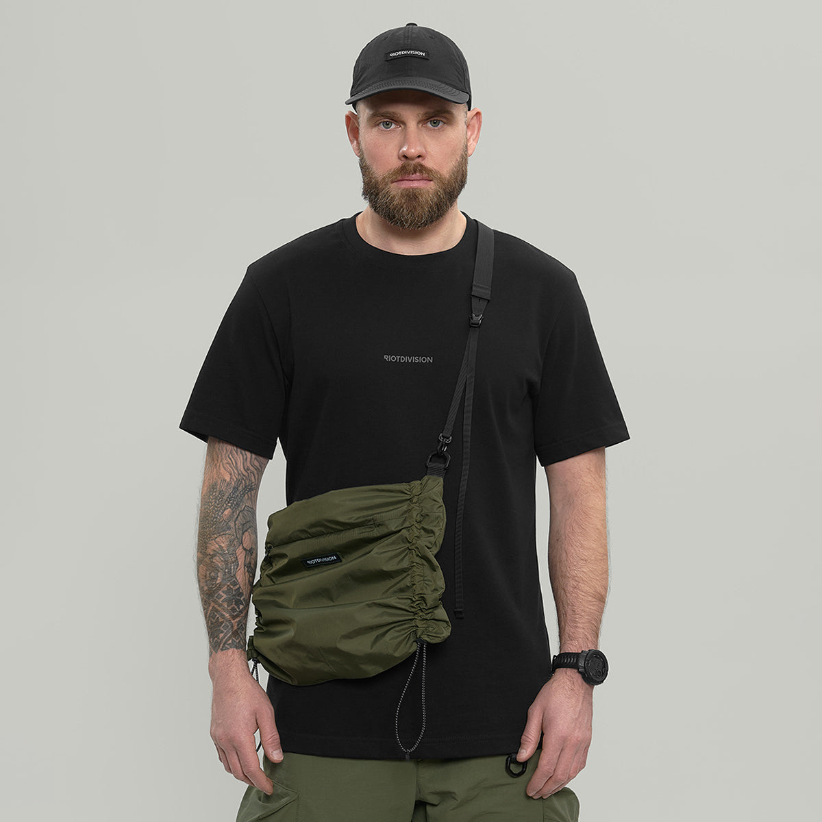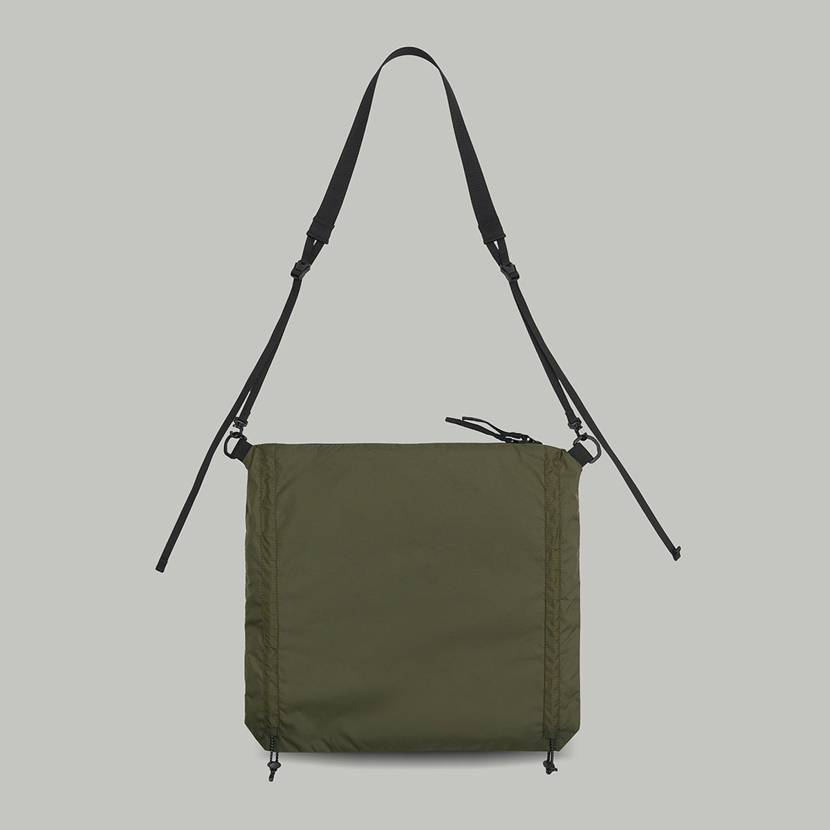 Lightweight shoulder bag made of ripstop nylon with elastic cords on the sides to provide volume adjustability.
