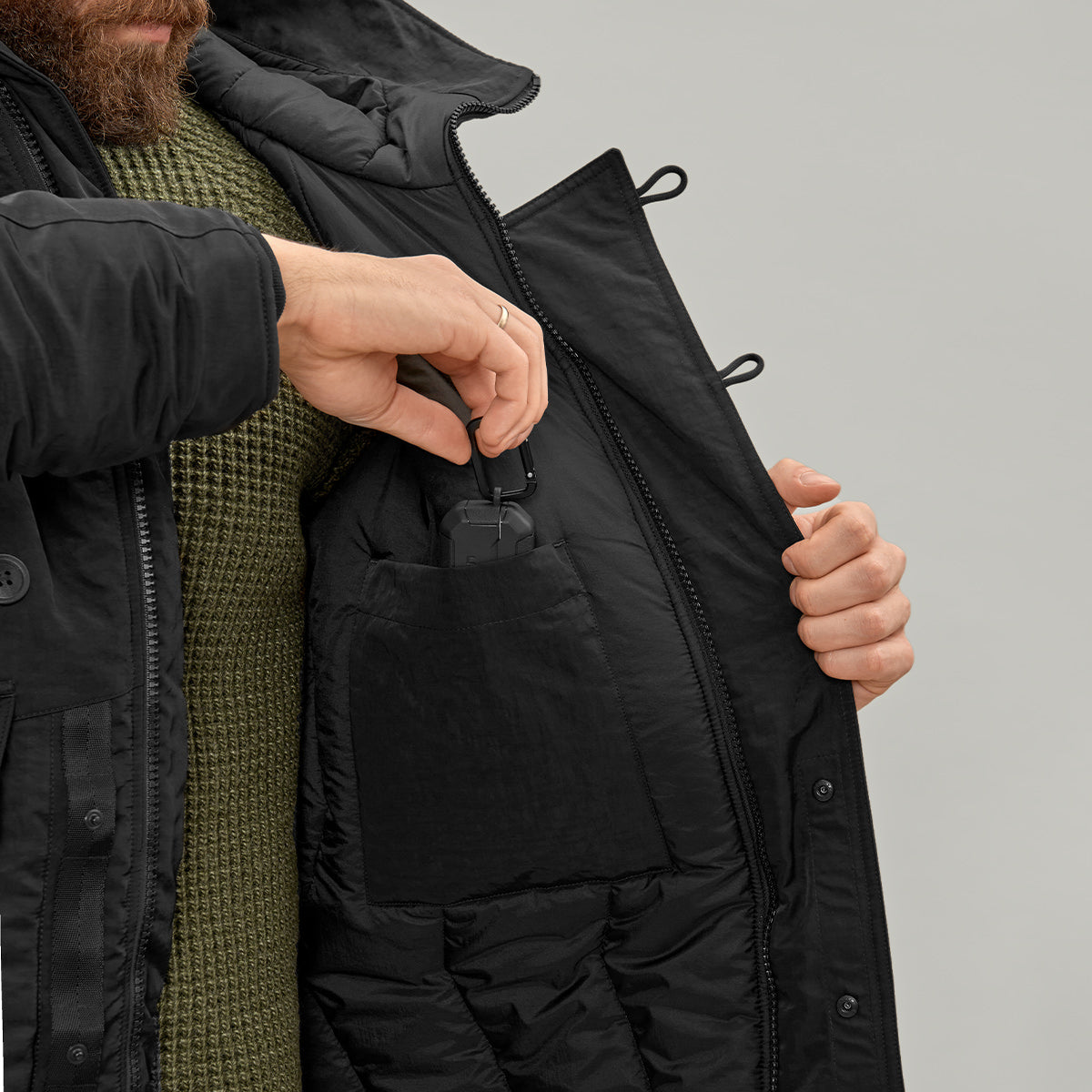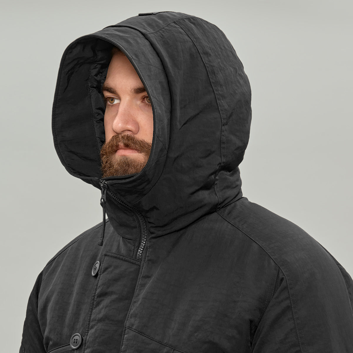 RD's approach into classical military N-3B parka. Made of DWR coated heavy duty nylon with Sorona insulation to provide -15C comfort.