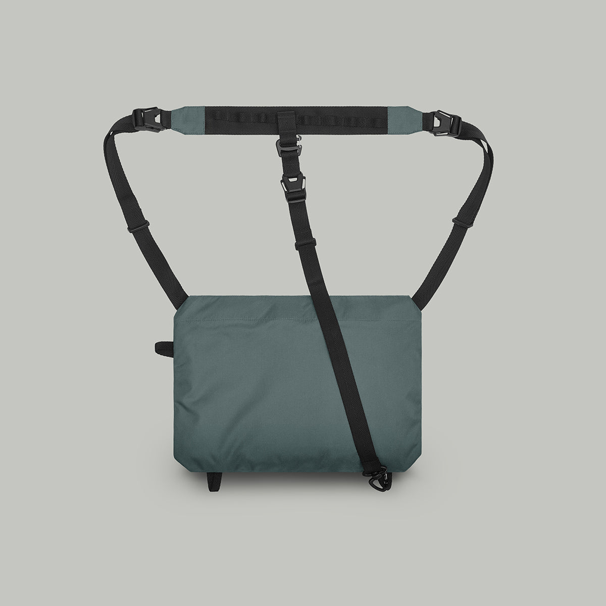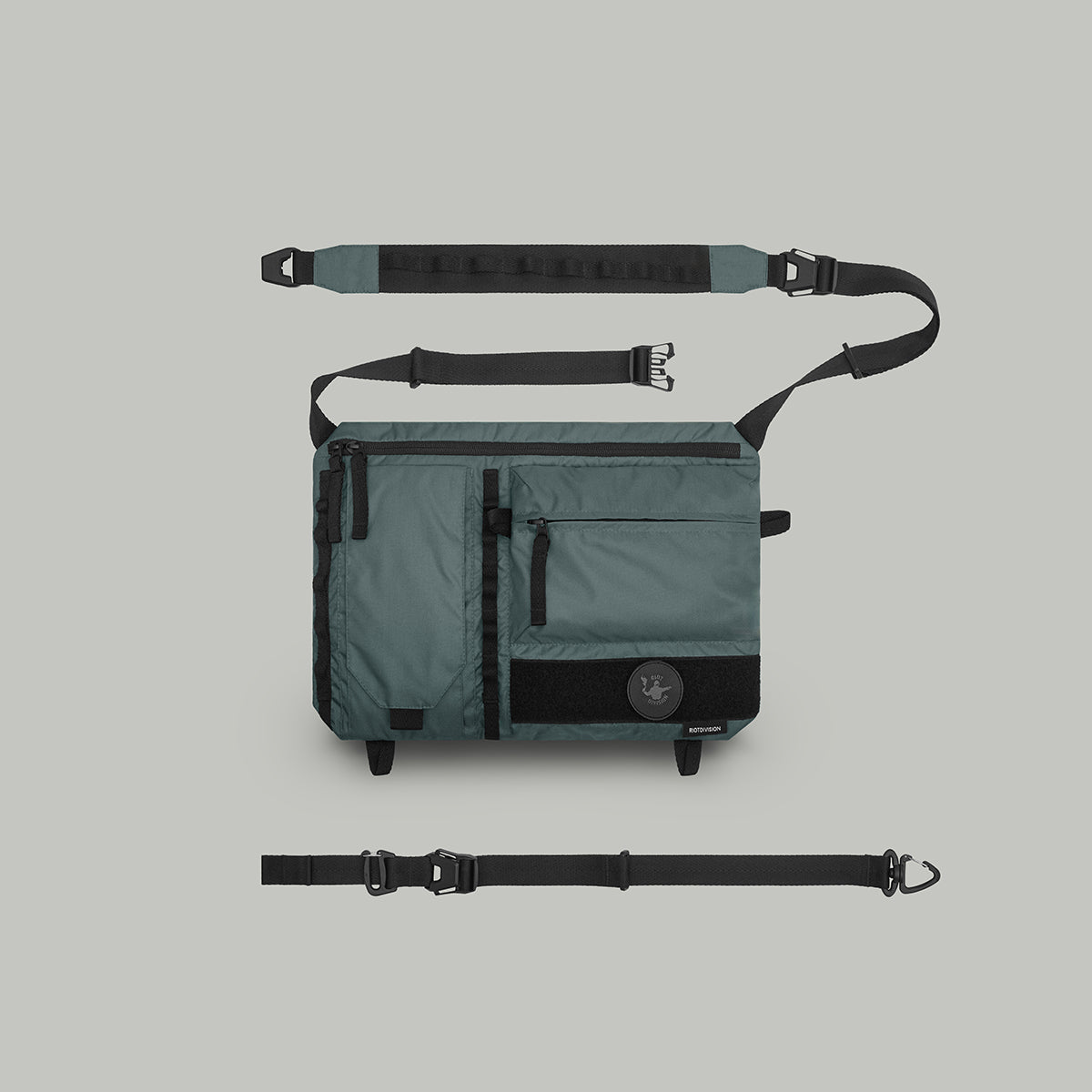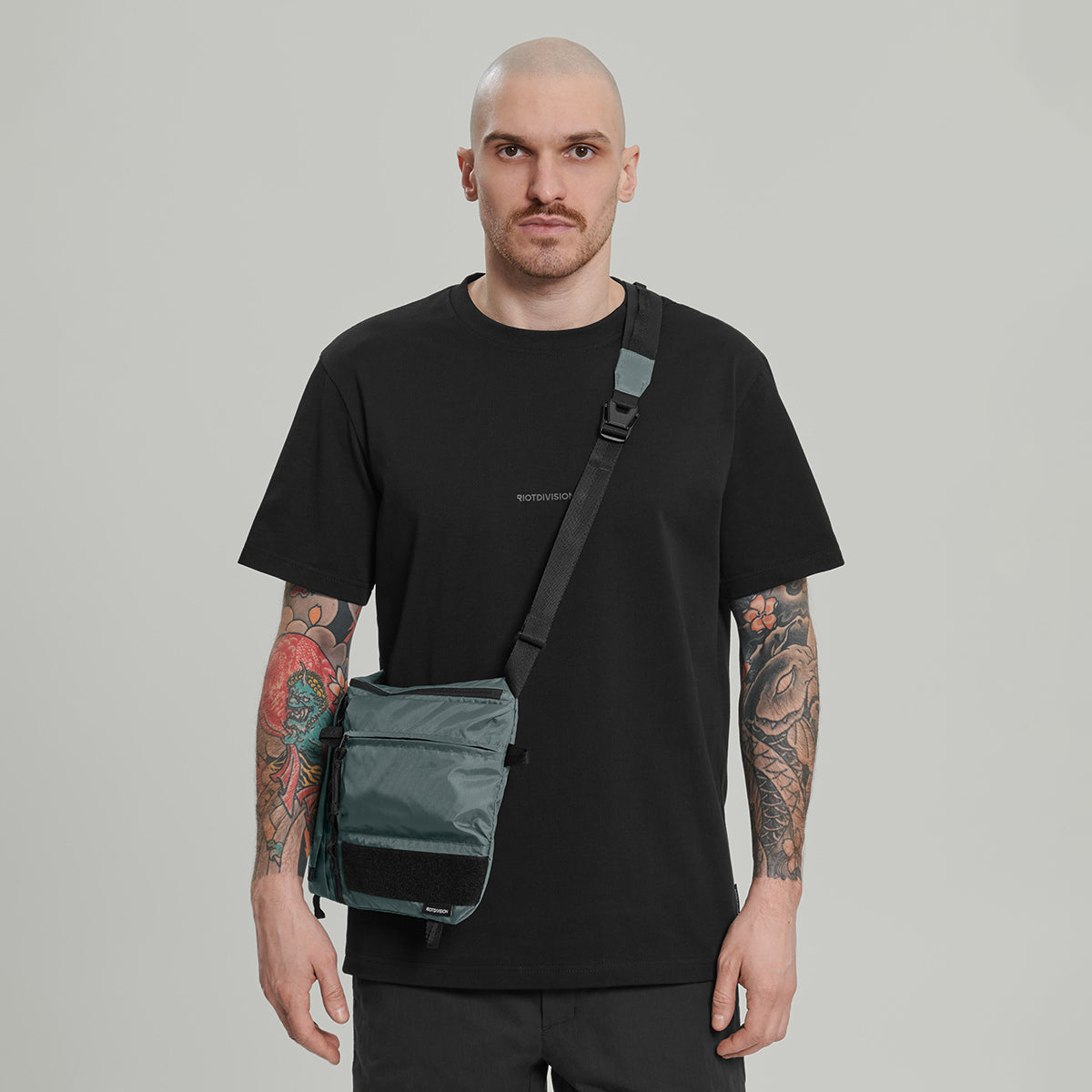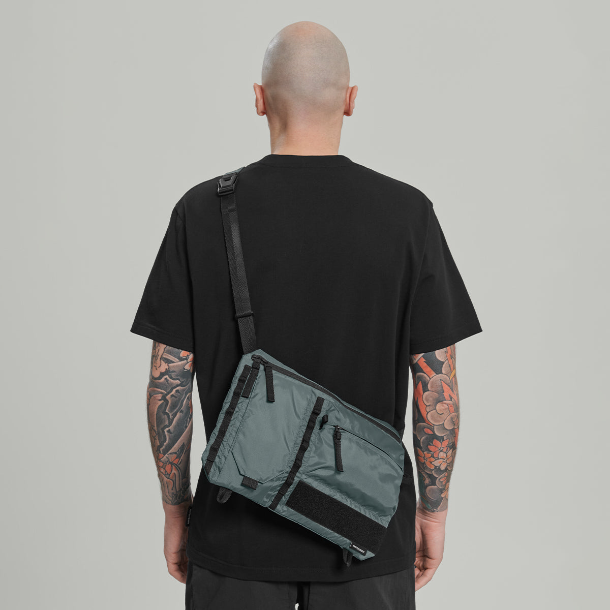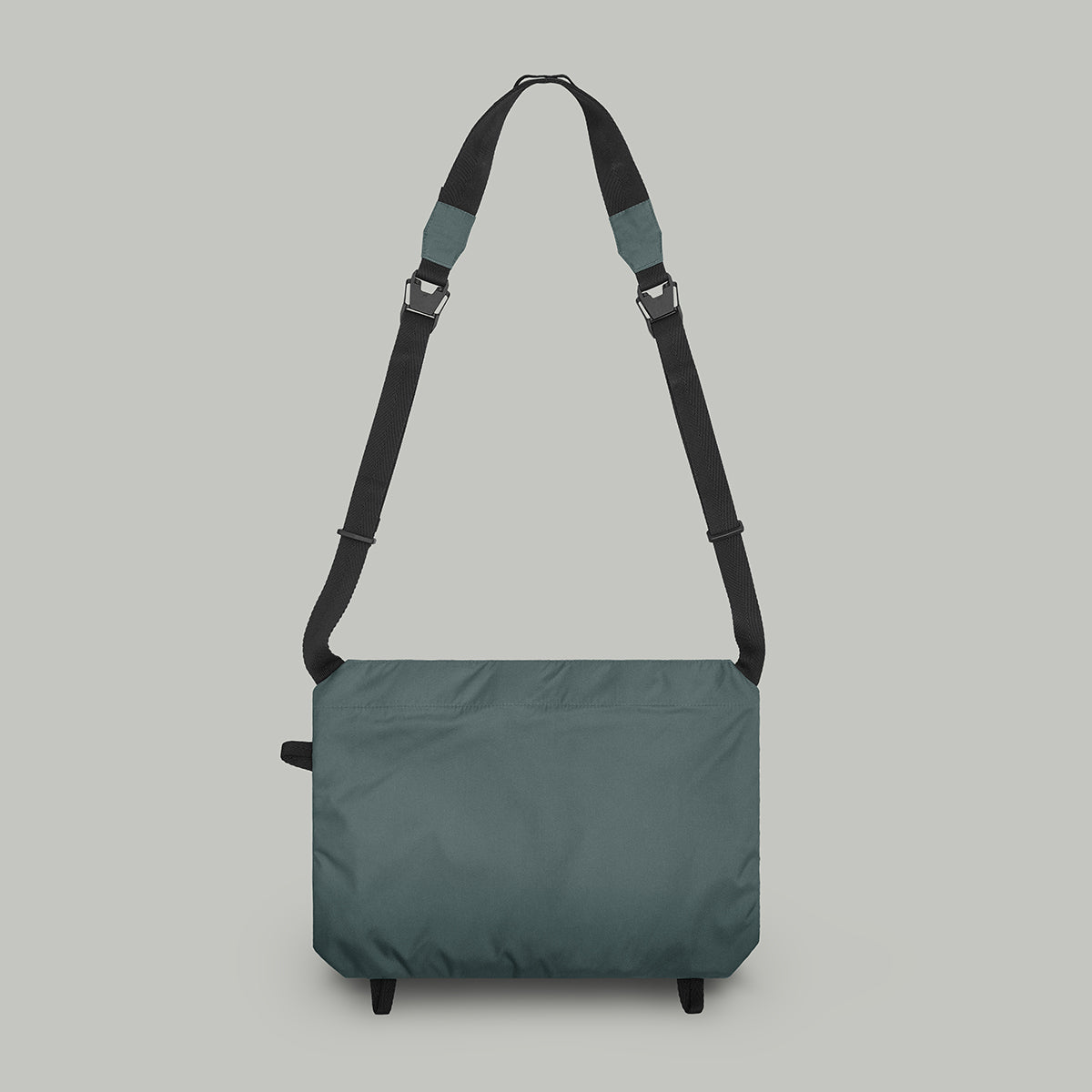 Mid-sized shoulder bag, made of DWR coated nylon. Perfect for carrying everyday objects. Fits tablet, 13" laptop.