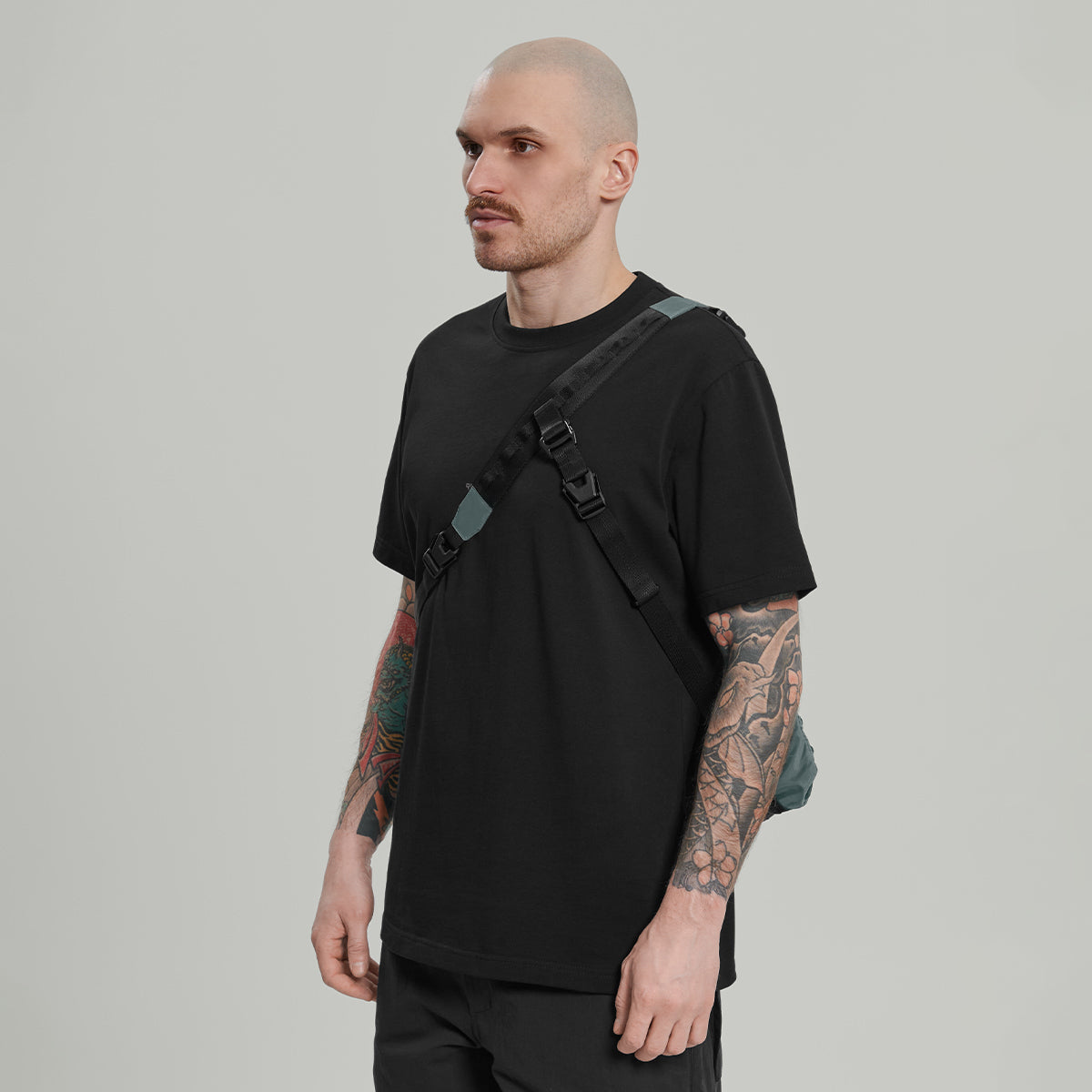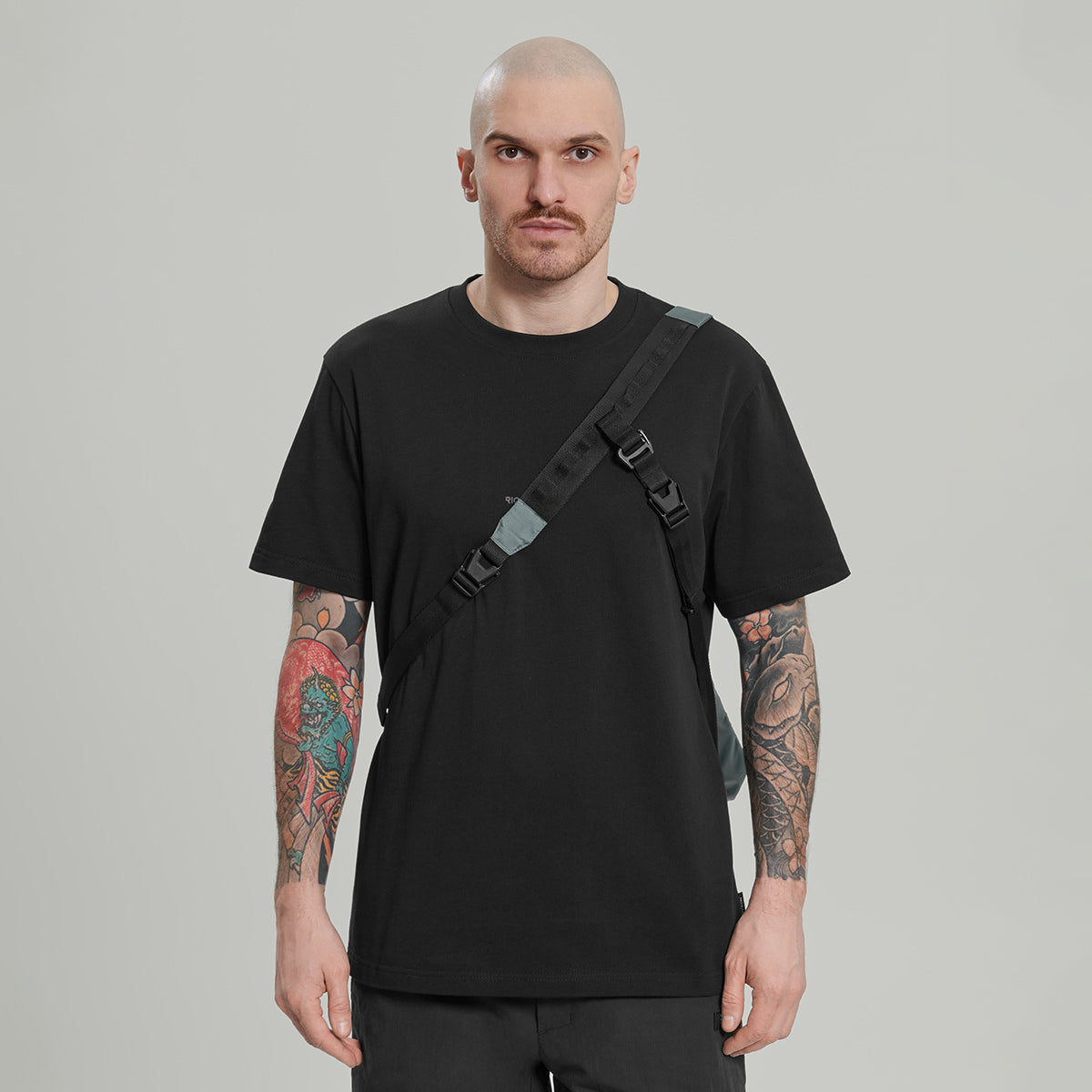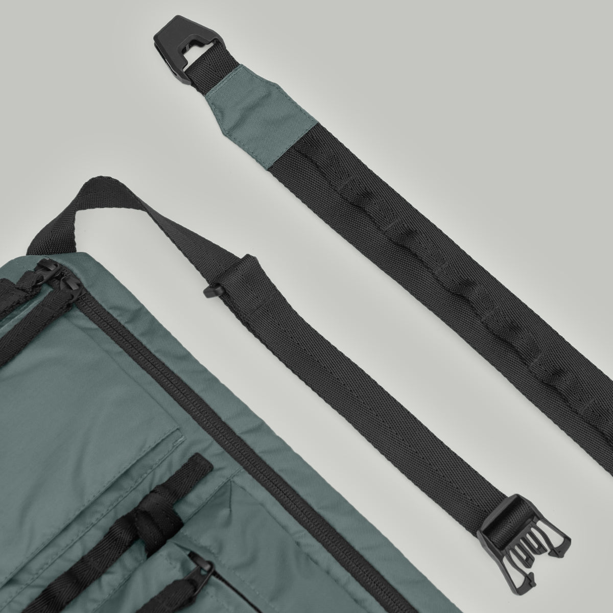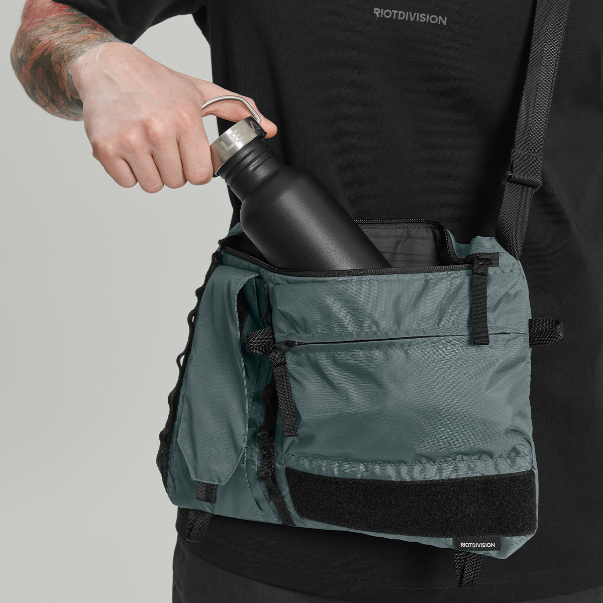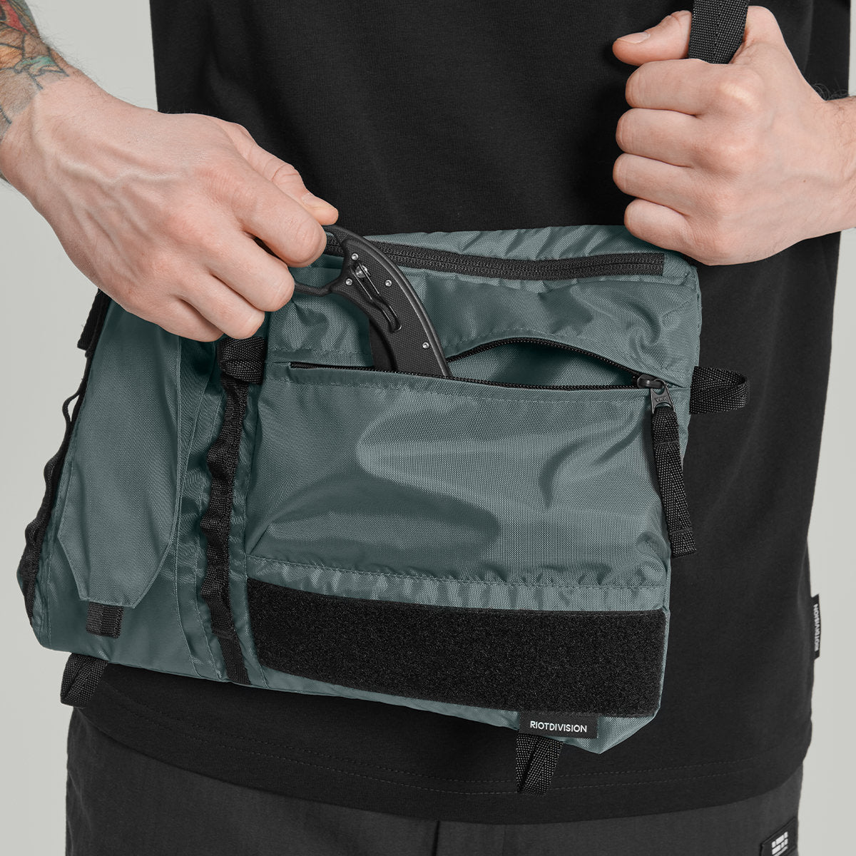 Mid-sized shoulder bag, made of DWR coated nylon. Perfect for carrying everyday objects. Fits tablet, 13" laptop.