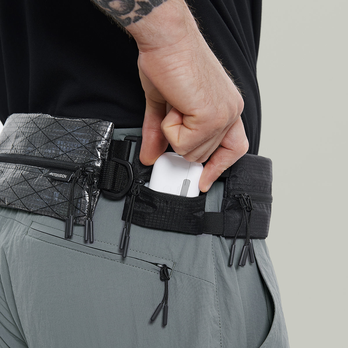Three piece design elasticated belt with a unique fitting, fixation and carrying options.